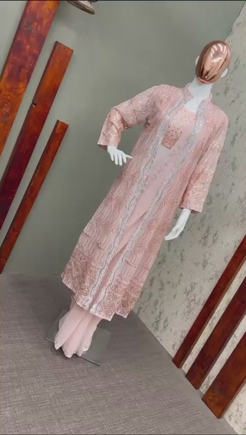 The blouse is made from Georgette fabric and features sequence embroidery work. It is unstitched with a length of 0.80 meters, allowing for custom fitting. The set also includes a Georgette Koti shrug, fully stitched with beautiful sequence embroidery all over the fabric. The shrug has a stylish finish with piping and overlocking, and it is designed in a free size that fits most.