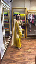 This Ready-to-Wear Saree is crafted from soft and flowy Heavy Chinon fabric and designed for easy draping. It features intricate embroidery cording work with real mirror embellishments and digital print details.