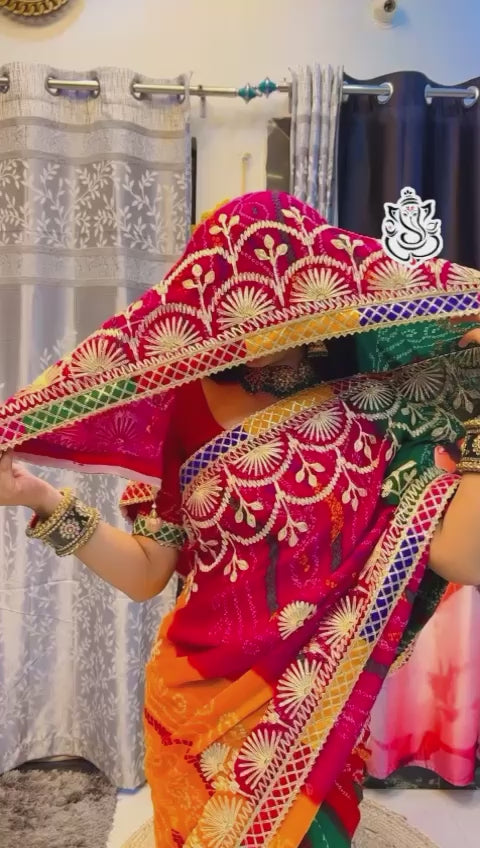 Saree | Moss Fabric of Bhandej with Hand Gota Patti Work, Readymade Lace Border, Heavy 4 Tussle in Pallu |